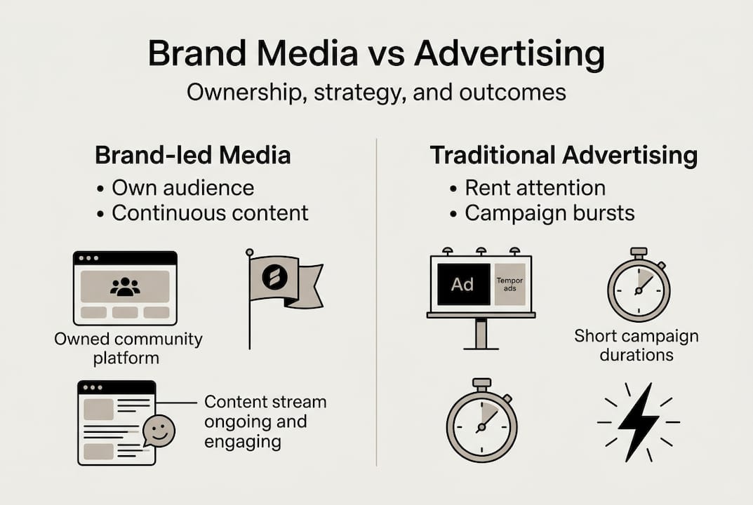Brand-led media focuses on entertaining, journalistic content owned by brands, while traditional advertising relies on paid campaigns and third-party channels. The key distinction is ownership: brand-led media builds audiences you control rather than renting attention you do not.