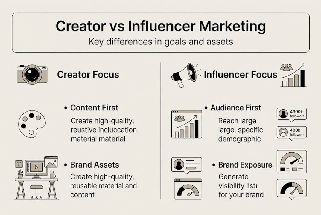 Creator marketing focuses on content production and UGC for repurposing as brand-owned assets, whereas influencer marketing leverages personal audience reach for endorsements. That single distinction changes almost everything about how you plan, brief, and measure a campaign.