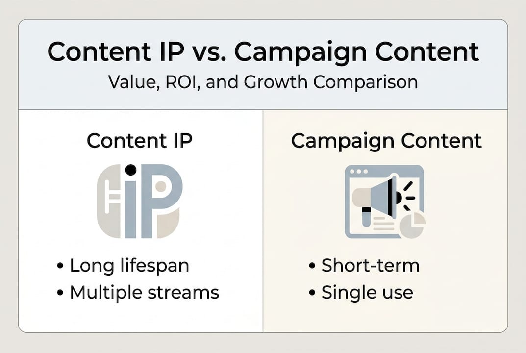 Traditional content is campaign output. It serves a brief, gets deployed, and is retired. Content IP is a strategic asset. It can be repackaged, sold, licensed to partners, and extended into new formats without starting from scratch. The distinction matters enormously when you're thinking about long-term brand equity rather than short-term conversion metrics.